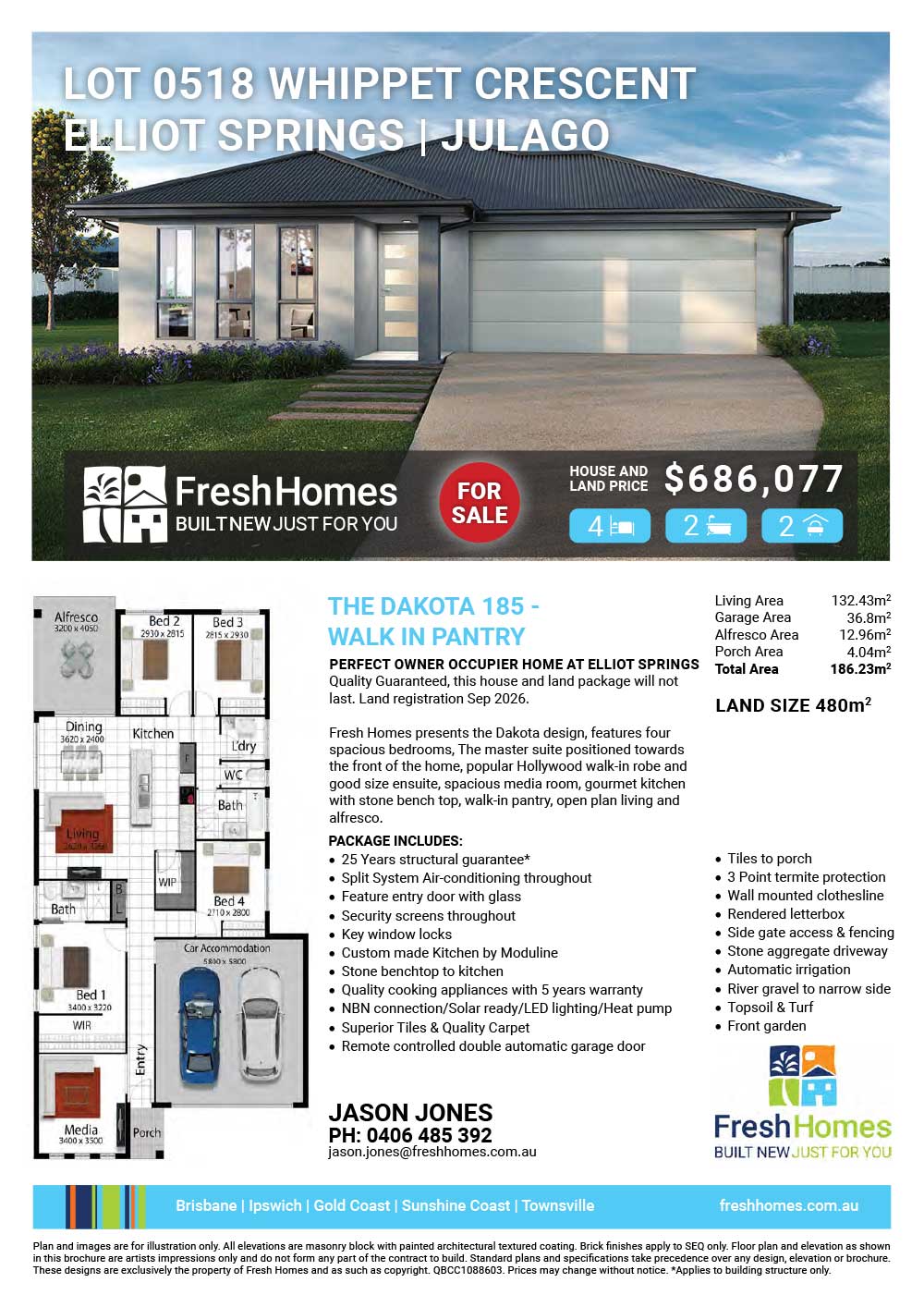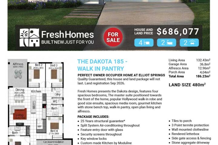 Fresh Homes presents the Dakota design, features four spacious bedrooms, The master suite positioned towards the front of the home, popular Hollywood walk-in robe and good size ensuite, spacious media room, gourmet kitchen with stone bench top, walk-in pantry, open plan living and alfresco.