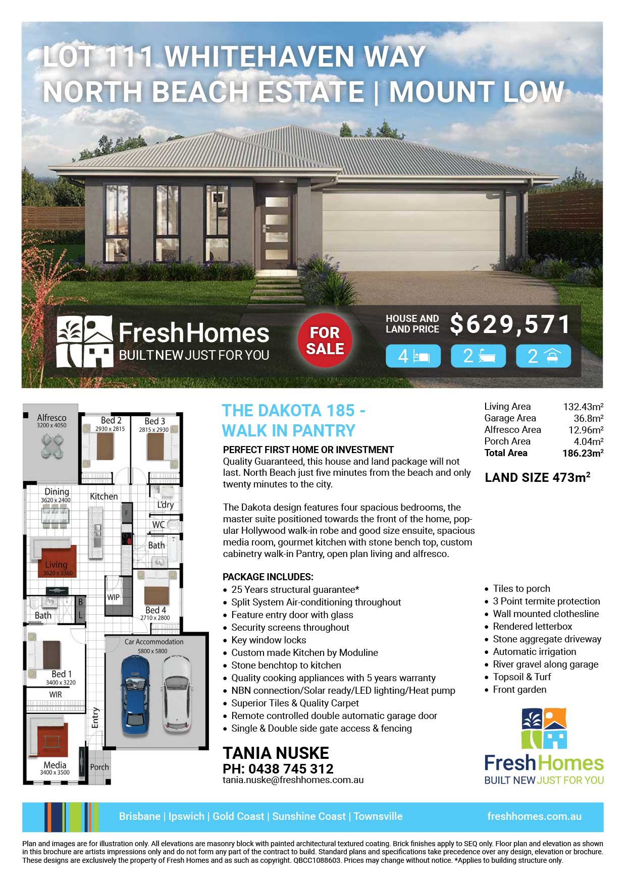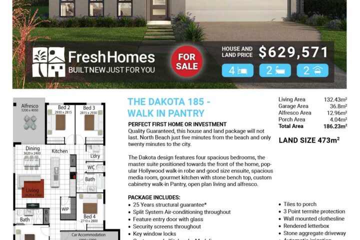 The Dakota design features four spacious bedrooms, the master suite positioned towards the front of the home, popular Hollywood walk-in robe and good size ensuite, spacious media room, gourmet kitchen with stone bench top, custom cabinetry walk-in Pantry, open plan living and alfresco.