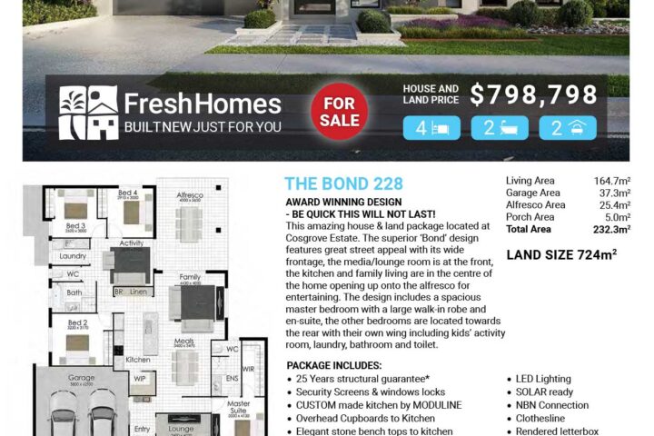 This amazing house & land package located at Cosgrove Estate. The superior ‘Bond’ design features great street appeal with its wide frontage, the media/lounge room is at the front, the kitchen and family living are in the centre of the home opening up onto the alfresco for entertaining. The design includes a spacious master bedroom with a large walk-in robe and en-suite, the other bedrooms are located towards the rear with their own wing including kids’ activity room, laundry, bathroom and toilet. The good size alfresco is overlooking spacious rear yard enough room for a shed and pool.