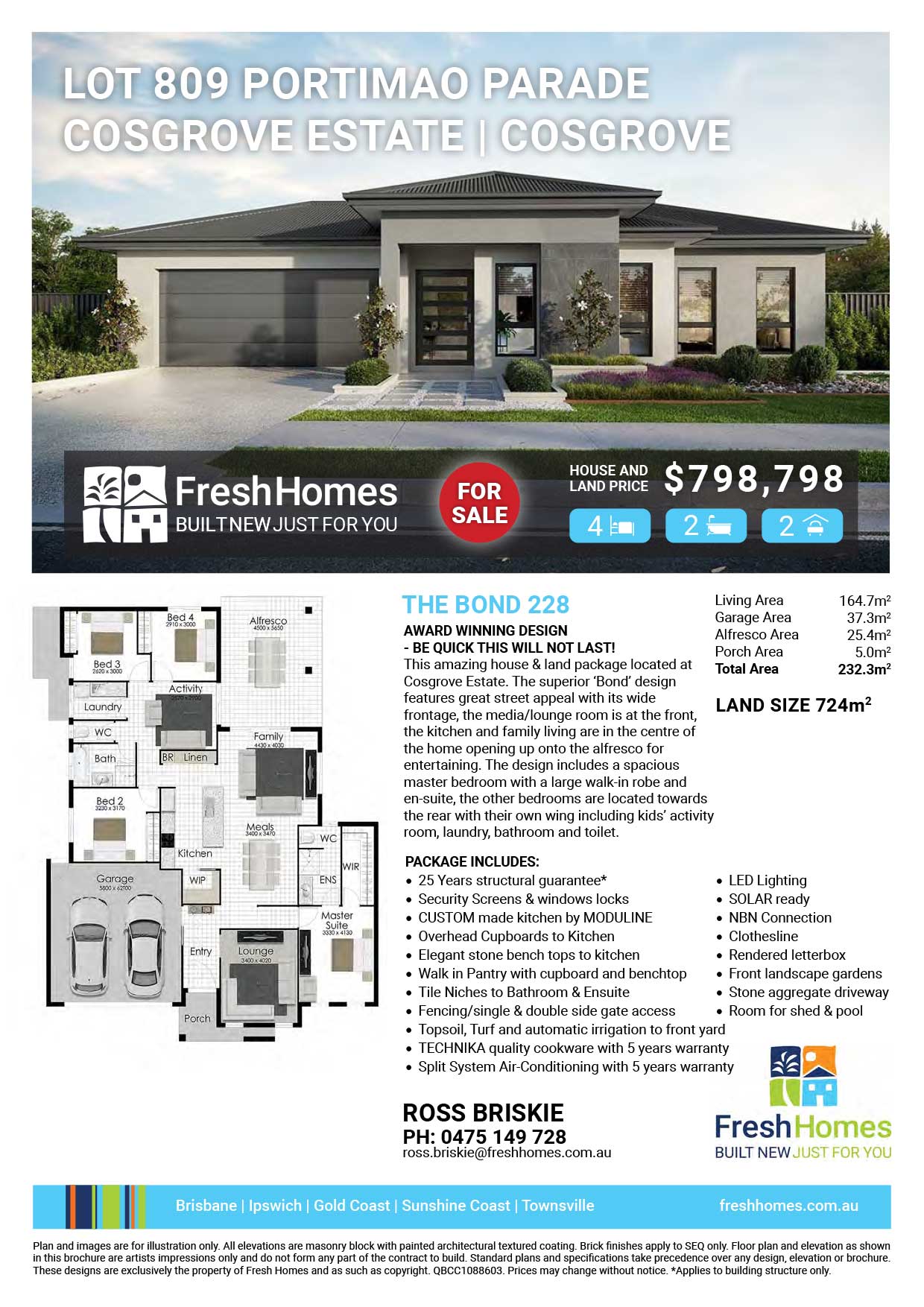 This package is to build once contracts have been done, colours chosen, working & engineered plans, covenant approval, finance approval, land settlement and council approvals have been done. Contact Ross Briskie on 0475 149 728 to secure this package. |