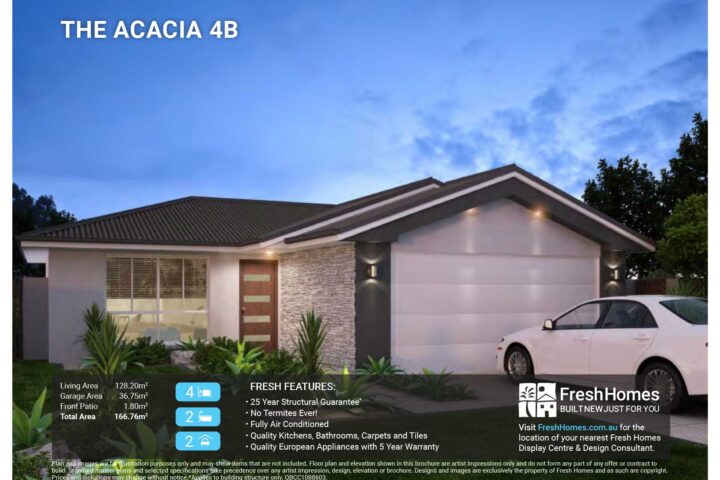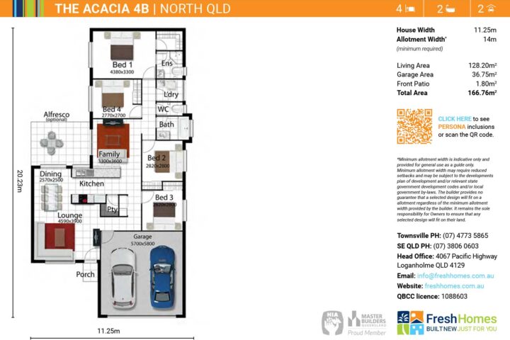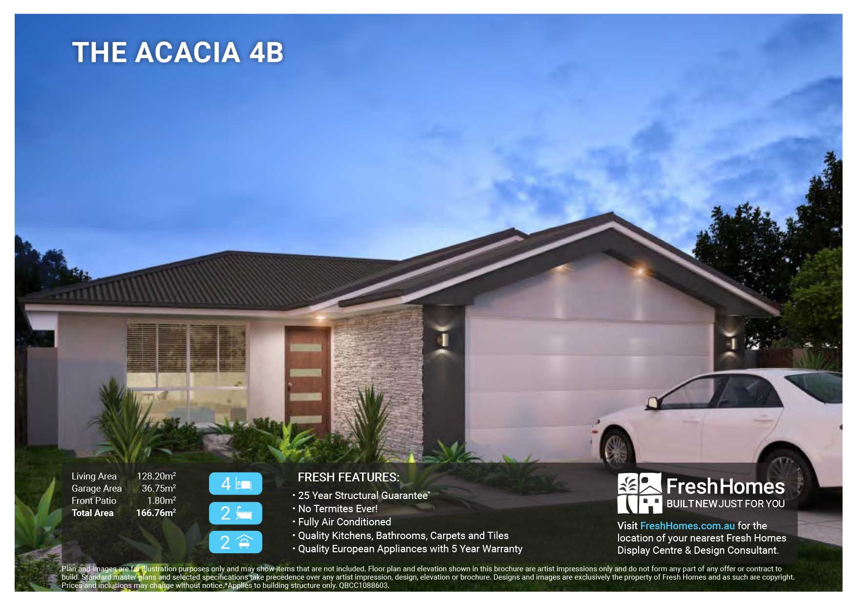 Plan and images are for illustration purposes only and may show items that are not included. Floor plan and elevation shown in this brochure are artist impressions only and do not form any part of any offer or contract to build. Standard master plans and selected specifications take precedence over any artist impression, design, elevation or brochure. Designs and images are exclusively the property of Fresh Homes and as such are copyright. Prices and inclusions may change without notice.*Applies to building structure only. QBCC1088603.