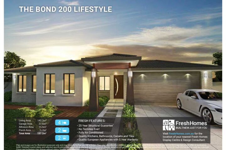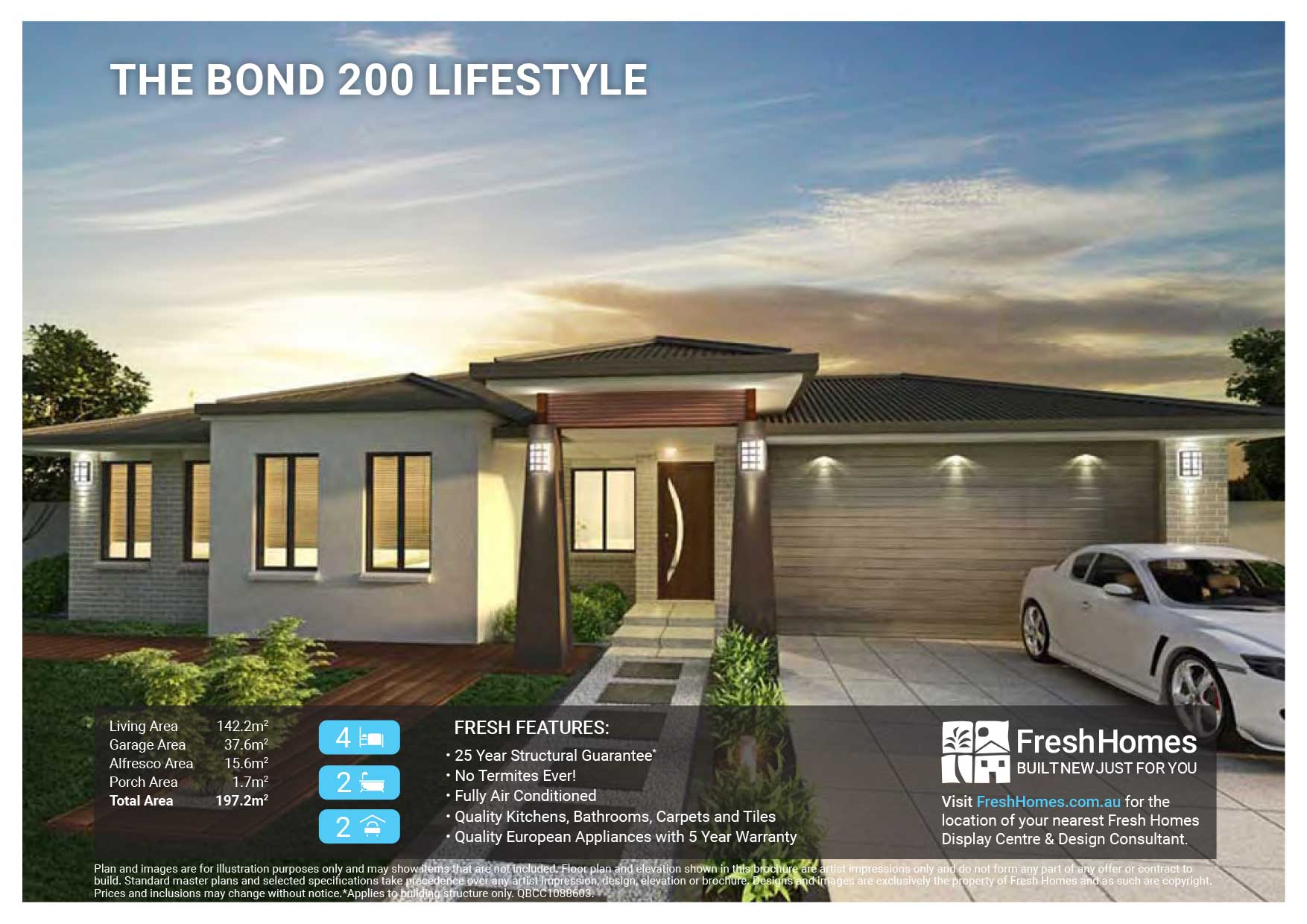 Plan and images are for illustration purposes only and may show items that are not included. Floor plan and elevation shown in this brochure are artist impressions only and do not form any part of any offer or contract to build. Standard master plans and selected specifications take precedence over any artist impression, design, elevation or brochure. Designs and images are exclusively the property of Fresh Homes and as such are copyright.  Prices and inclusions may change without notice.*Applies to building structure only. QBCC1088603.