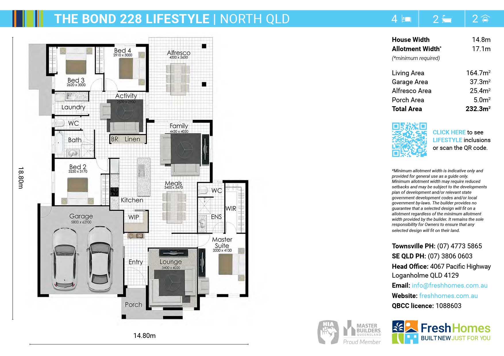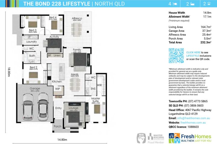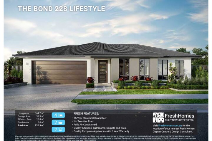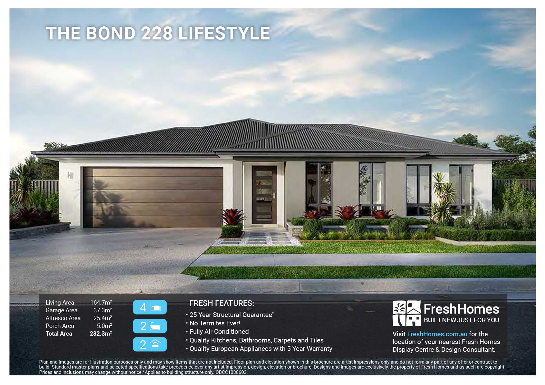 Plan and images are for illustration purposes only and may show items that are not included. Floor plan and elevation shown in this brochure are artist impressions only and do not form any part of any offer or contract to build. Standard master plans and selected specifications take precedence over any artist impression, design, elevation or brochure. Designs and images are exclusively the property of Fresh Homes and as such are copyright. Prices and inclusions may change without notice.*Applies to building structure only. QBCC1088603.
