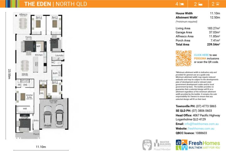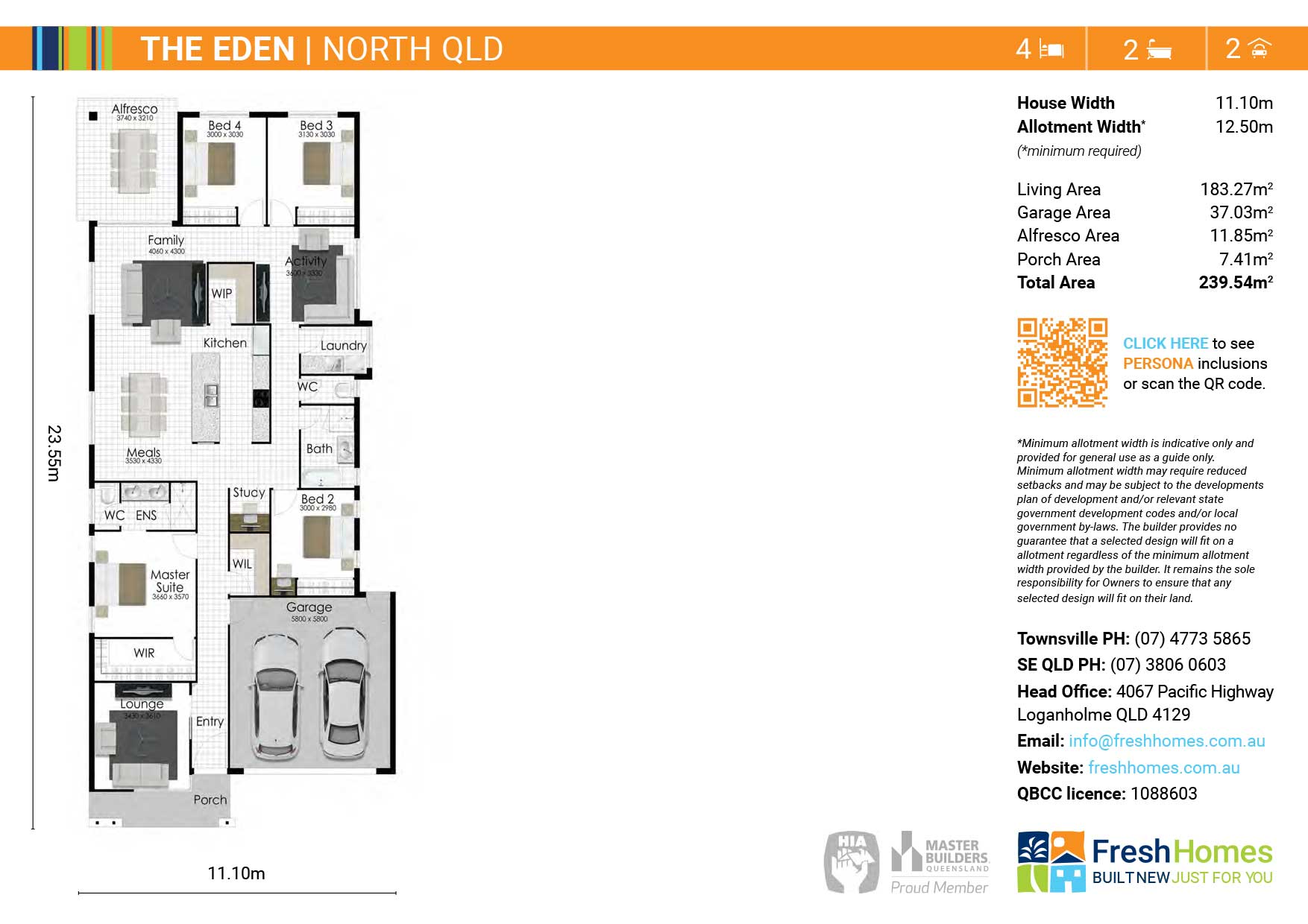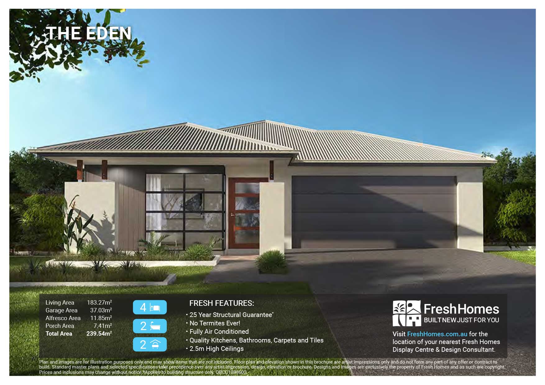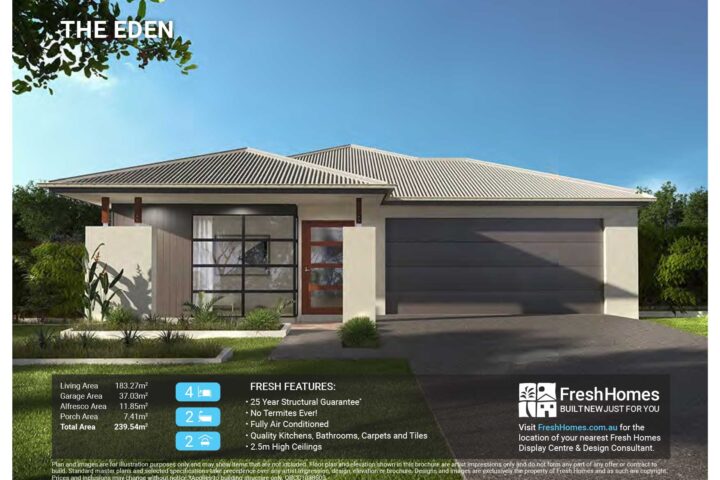 Plan and images are for illustration purposes only and may show items that are not included. Floor plan and elevation shown in this brochure are artist impressions only and do not form any part of any offer or contract to build. Standard master plans and selected specifications take precedence over any artist impression, design, elevation or brochure. Designs and images are exclusively the property of Fresh Homes and as such are copyright. Prices and inclusions may change without notice.*Applies to building structure only. QBCC1088603.