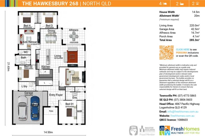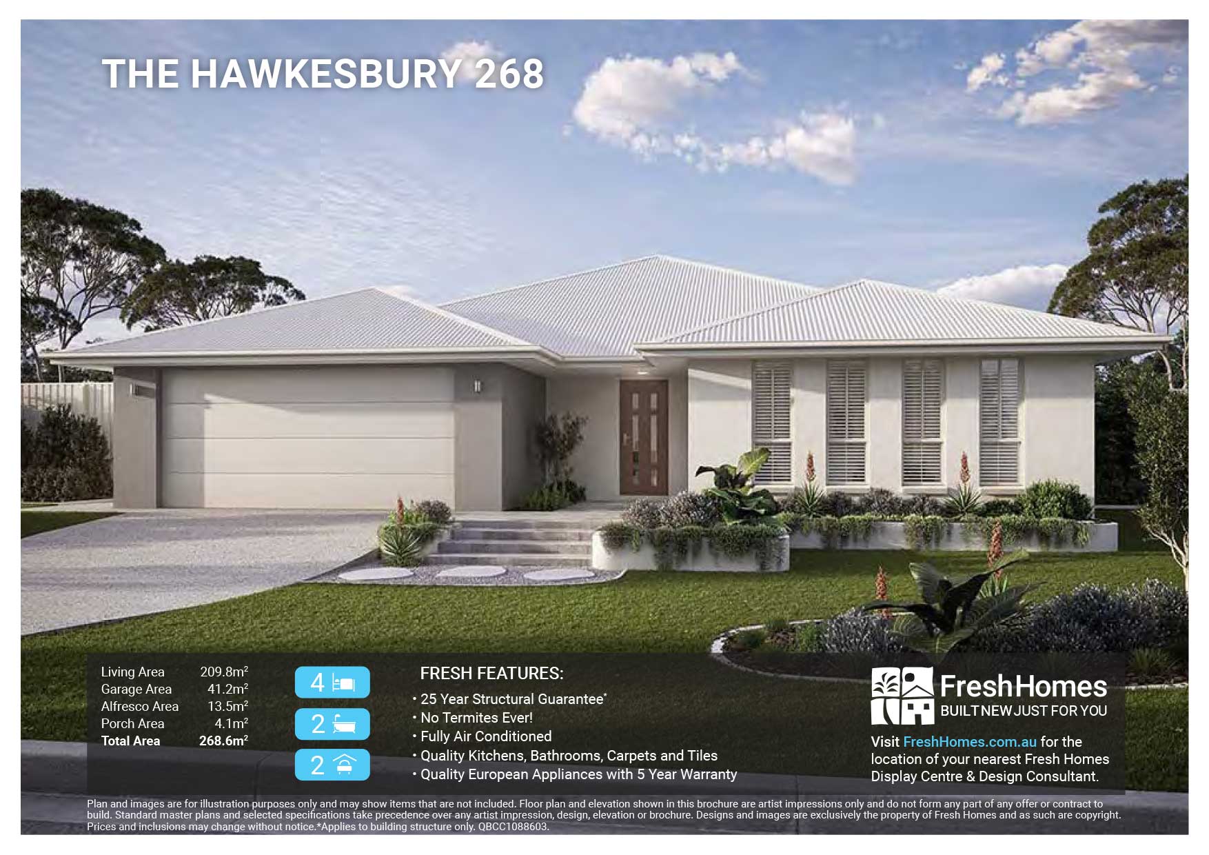 Plan and images are for illustration purposes only and may show items that are not included. Floor plan and elevation shown in this brochure are artist impressions only and do not form any part of any offer or contract to build. Standard master plans and selected specifications take precedence over any artist impression, design, elevation or brochure. Designs and images are exclusively the property of Fresh Homes and as such are copyright. Prices and inclusions may change without notice.*Applies to building structure only. QBCC1088603.