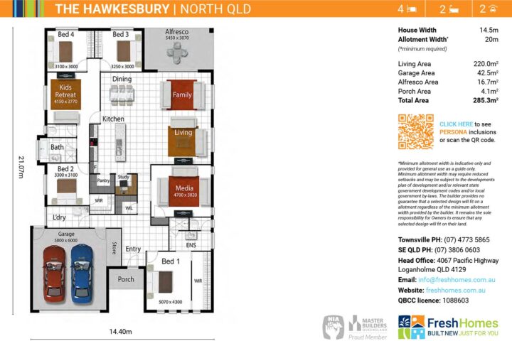 Plan and images are for illustration purposes only and may show items that are not included. Floor plan and elevation shown in this brochure are artist impressions only and do not form any part of any offer or contract to build. Standard master plans and selected specifications take precedence over any artist impression, design, elevation or brochure. Designs and images are exclusively the property of Fresh Homes and as such are copyright. Prices and inclusions may change without notice.*Applies to building structure only. QBCC1088603.
