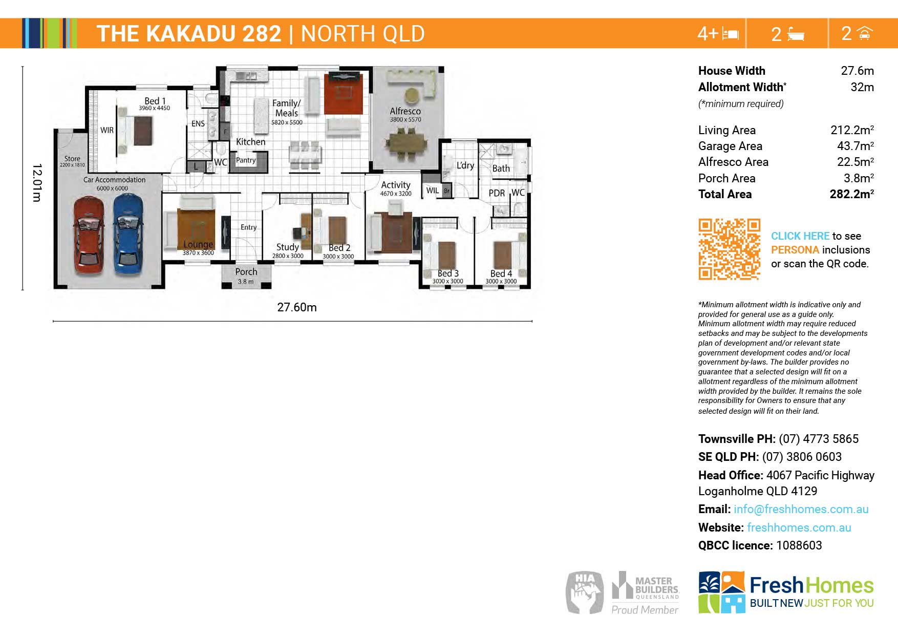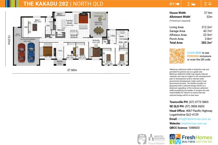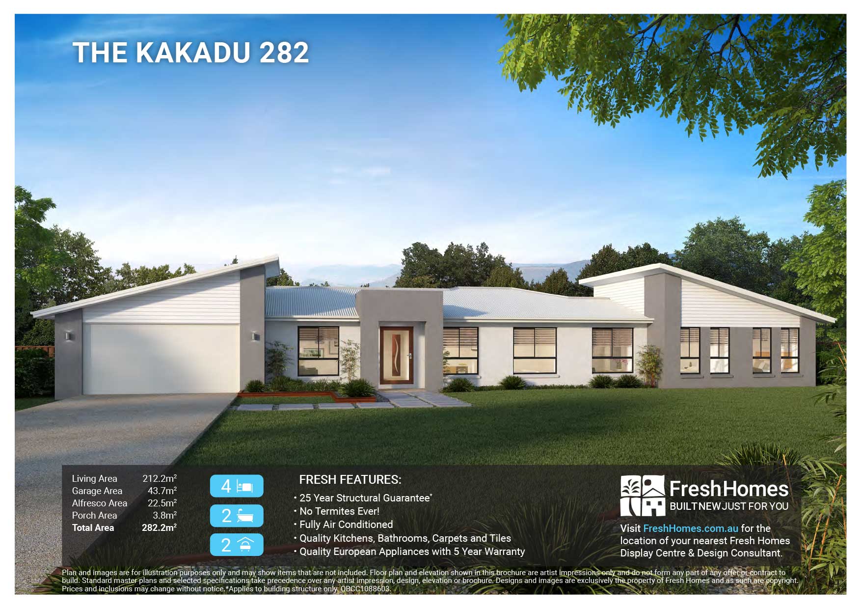 Plan and images are for illustration purposes only and may show items that are not included. Floor plan and elevation shown in this brochure are artist impressions only and do not form any part of any offer or contract to build. Standard master plans and selected specifications take precedence over any artist impression, design, elevation or brochure. Designs and images are exclusively the property of Fresh Homes and as such are copyright. Prices and inclusions may change without notice.*Applies to building structure only. QBCC1088603.