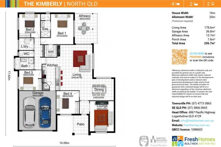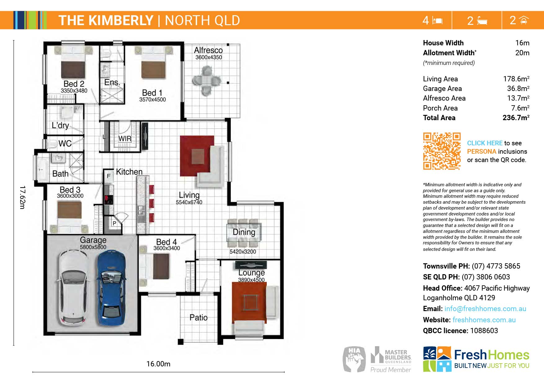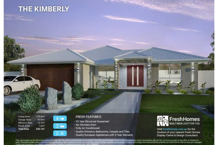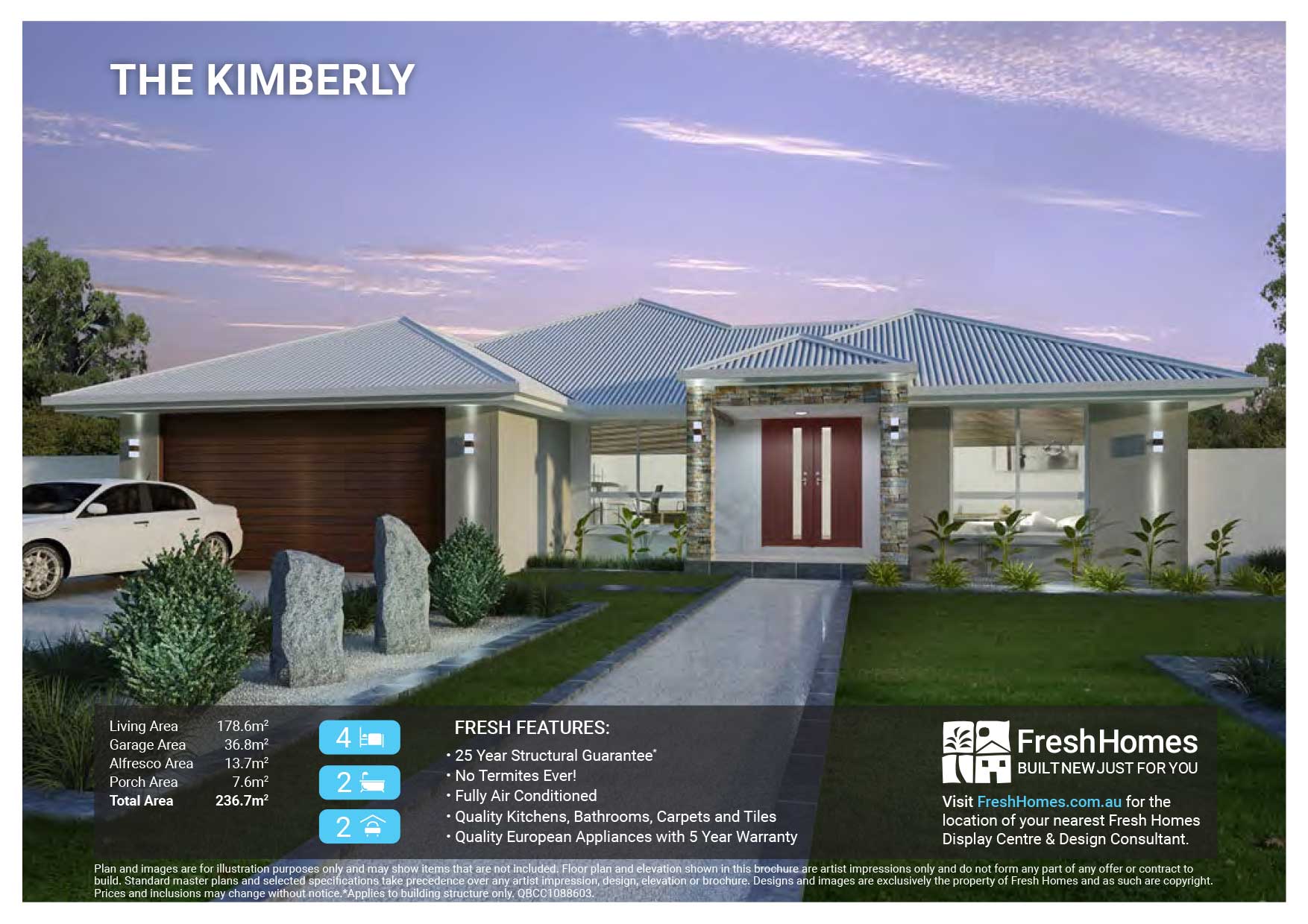 Plan and images are for illustration purposes only and may show items that are not included. Floor plan and elevation shown in this brochure are artist impressions only and do not form any part of any offer or contract to build. Standard master plans and selected specifications take precedence over any artist impression, design, elevation or brochure. Designs and images are exclusively the property of Fresh Homes and as such are copyright.  Prices and inclusions may change without notice.*Applies to building structure only. QBCC1088603.