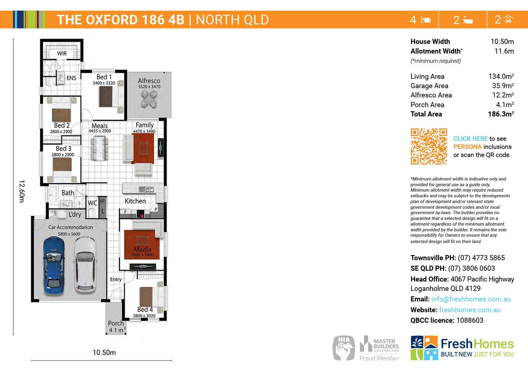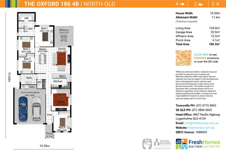 Plan and images are for illustration purposes only and may show items that are not included. Floor plan and elevation shown in this brochure are artist impressions only and do not form any part of any offer or contract to build. Standard master plans and selected specifications take precedence over any artist impression, design, elevation or brochure. Designs and images are exclusively the property of Fresh Homes and as such are copyright.  Prices and inclusions may change without notice.*Applies to building structure only. QBCC1088603.