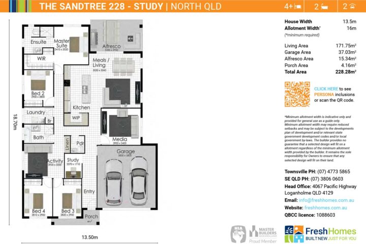Plan and images are for illustration purposes only and may show items that are not included. Floor plan and elevation shown in this brochure are artist impressions only and do not form any part of any offer or contract to build. Standard master plans and selected specifications take precedence over any artist impression, design, elevation or brochure. Designs and images are exclusively the property of Fresh Homes and as such are copyright.  Prices and inclusions may change without notice.*Applies to building structure only. QBCC1088603.