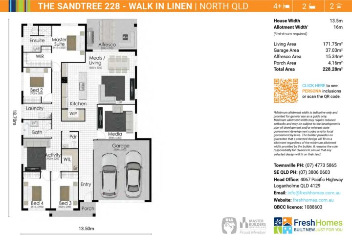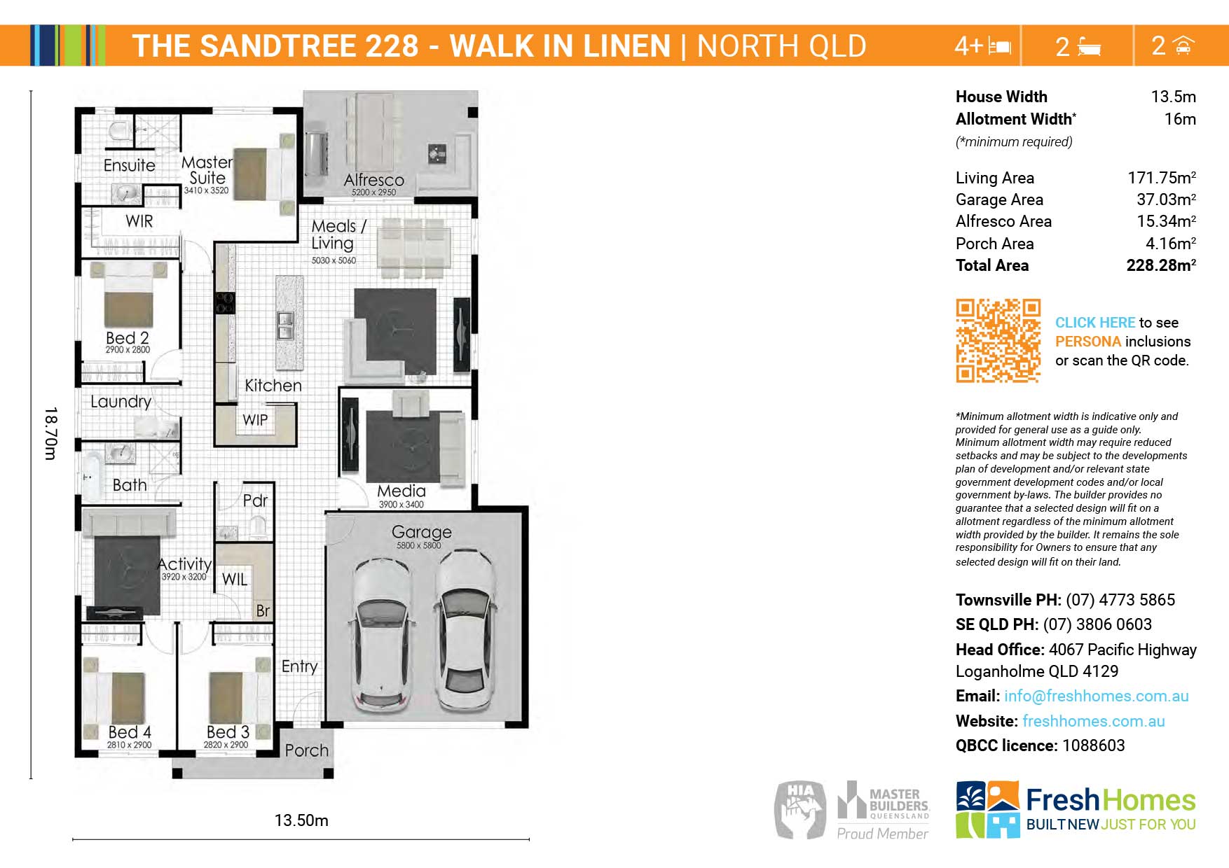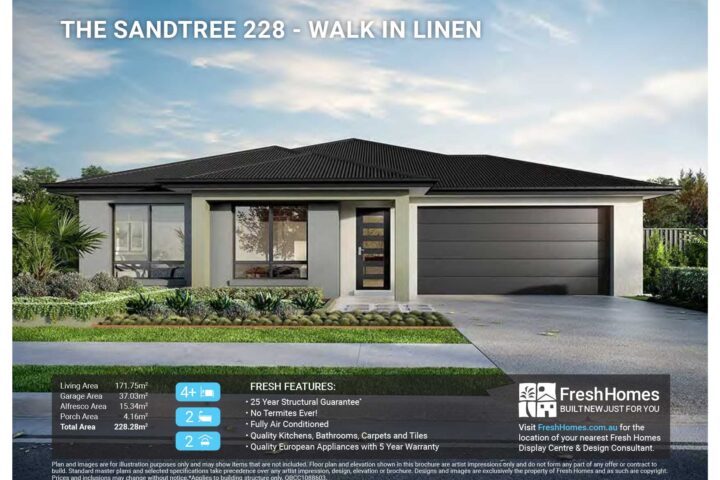 Plan and images are for illustration purposes only and may show items that are not included. Floor plan and elevation shown in this brochure are artist impressions only and do not form any part of any offer or contract to build. Standard master plans and selected specifications take precedence over any artist impression, design, elevation or brochure. Designs and images are exclusively the property of Fresh Homes and as such are copyright.  Prices and inclusions may change without notice.*Applies to building structure only. QBCC1088603.