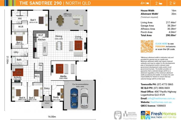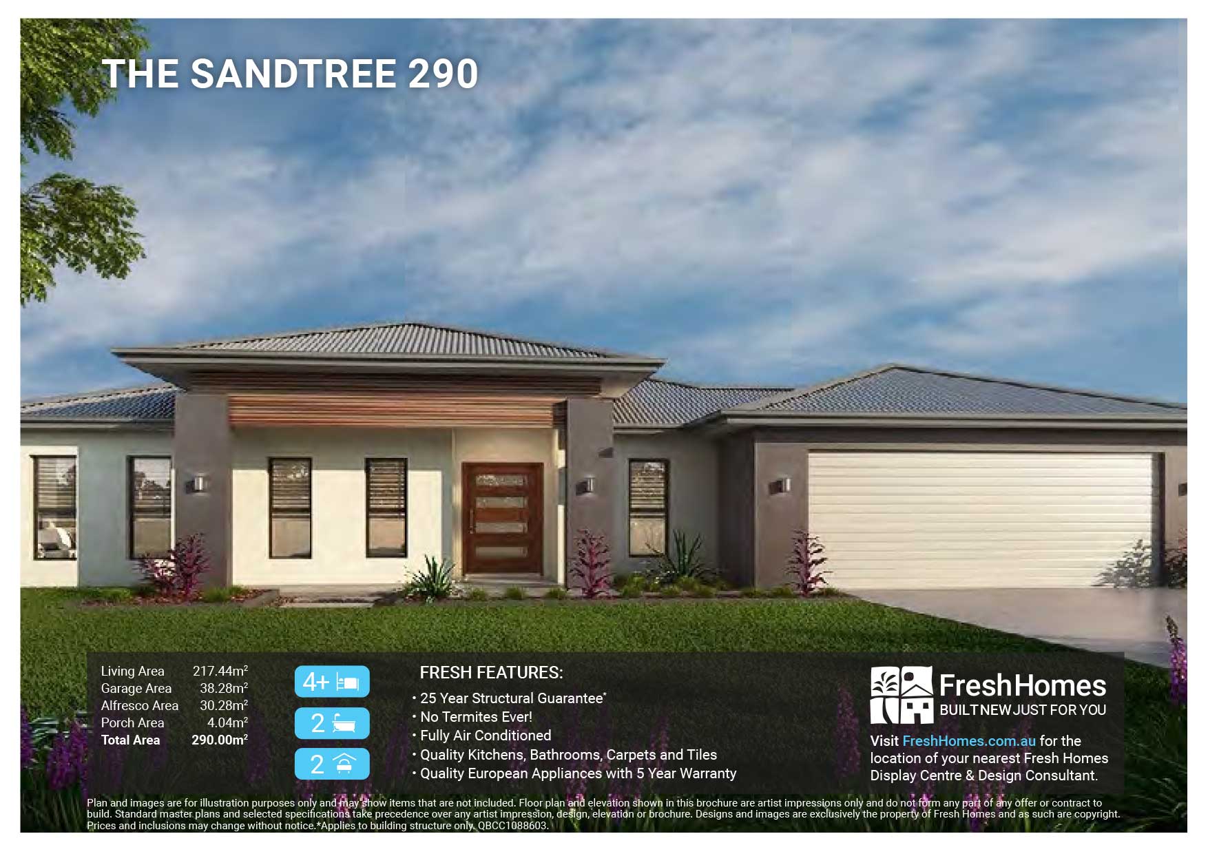Plan and images are for illustration purposes only and may show items that are not included. Floor plan and elevation shown in this brochure are artist impressions only and do not form any part of any offer or contract to build. Standard master plans and selected specifications take precedence over any artist impression, design, elevation or brochure. Designs and images are exclusively the property of Fresh Homes and as such are copyright. Prices and inclusions may change without notice.*Applies to building structure only. QBCC1088603.